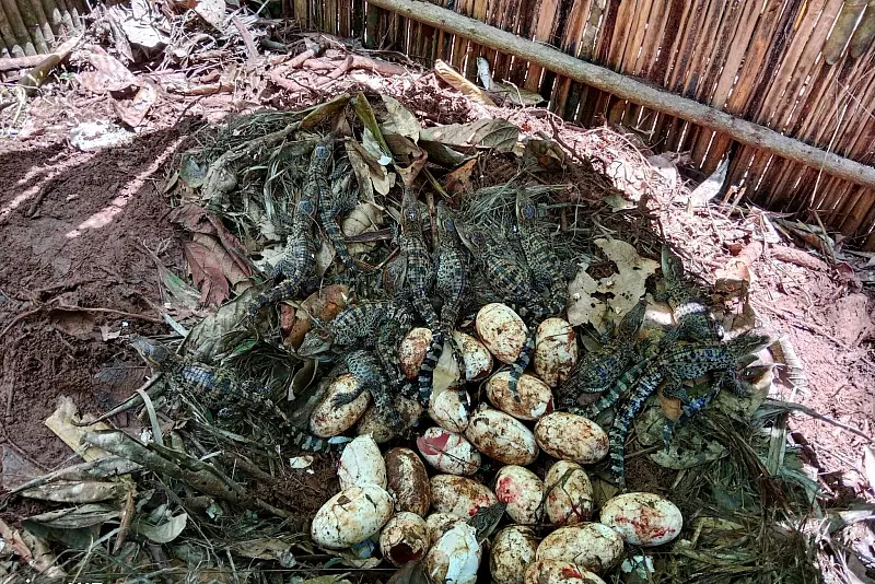 Der Fund erhöhe die Überlebenschancen dieser Reptilienart enorm, hieß es weiter. Die Eier wurden im Mai in einem Nationalpark in den Cardamom Mountains im Südwesten Kambodschas in fünf Nestern gefunden. Ende Juni schlüpften insgesamt 60 Baby-Krokodile.