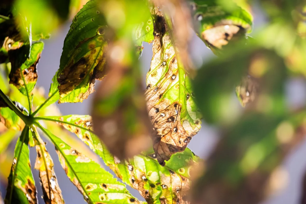 Rosskastanien-Miniermotten (Cameraria ohridella) sind rund fünf Millimeter lange, orange-weiß-gestreifte Kleinschmetterlinge, die ihre Eier auf Blattoberseiten des Kastanienbaums ablegen. Nach etwa drei Wochen schlüpfen Larven, die sich in den Wochen darauf durch das Blattinnere fressen, wie es beim Nabu heißt. Dadurch welken die Blätter des Baumes sehr schnell.