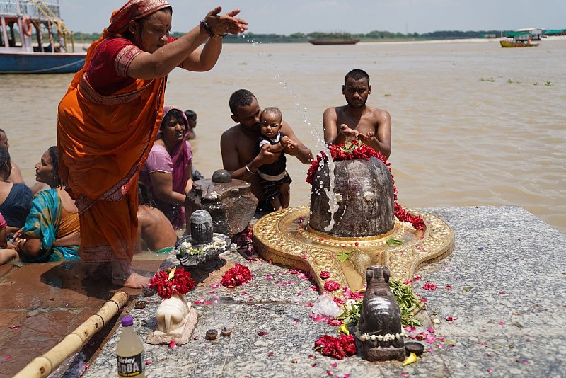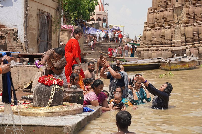 Einige hoffen, dass ihre Vorfahren Moksha erreichen können, wenn sie zwar anderswo verstorben sind, dann aber im Ganges verstreut werden. Sharmila etwa, die mit ihrer Familie und der Asche ihres Vaters und Bruders aus dem fernen westindischen Bundesstaat Maharashtra gekommen ist. Der Vater sei vor 18 Jahren gestorben, der Bruder vor einem Monat. Sie schütten auch heiliges Wasser über ein mit frischen Blumenkränzen geschmücktes Symbol des Gottes Lord Shiva und beten. «Wir haben bereits zu Hause getrauert», sagt Sharmila. «Jetzt lachen wir mit den Kindern.»