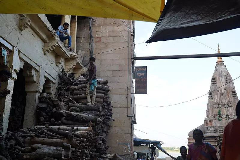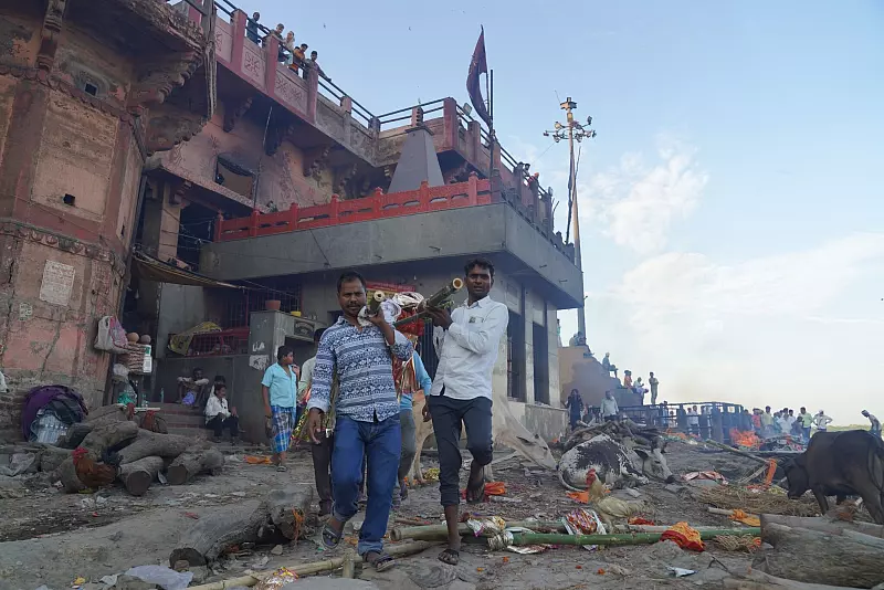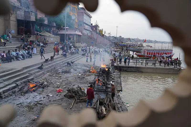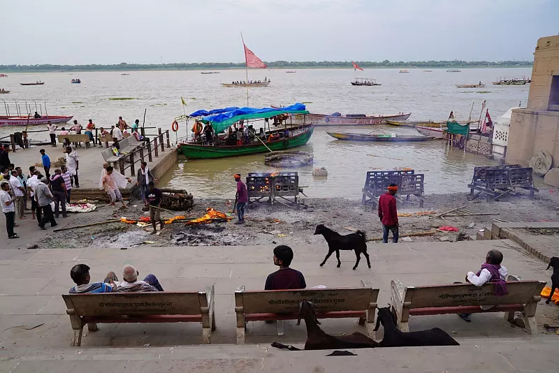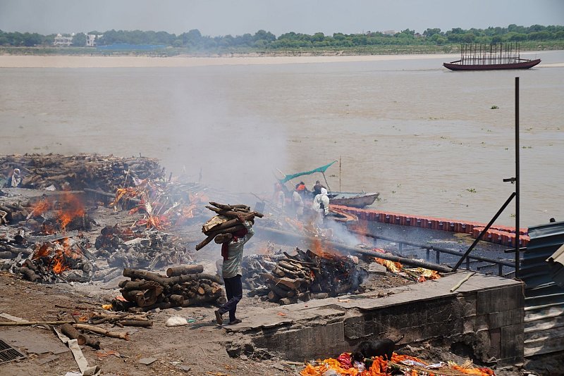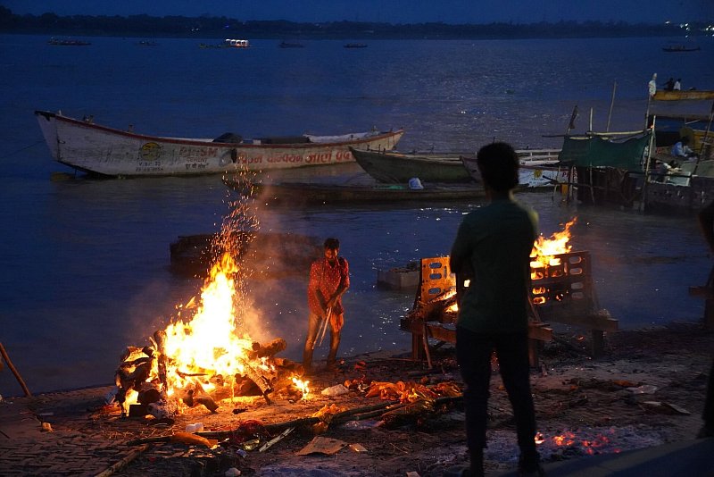 Das Verbrennen passiert am Ganges im Akkord. Einige Leichen liegen in weiße Tücher gehüllt auf Bahren auf den Boden. Das Weiß symbolisiert im Hinduismus Reinheit, Trauer und die Idee, dass sich die Seelen der Toten aufmachen. Daneben suchen Hunde in der Asche neben den Feuern nach Knochen. Ziegen meckern. Dom Chaudhary sagt, es dauere zweieinhalb bis drei Stunden, bis eine Leiche zu Asche wird. Dann übergeben die Angehörigen diese dem Ganges.
