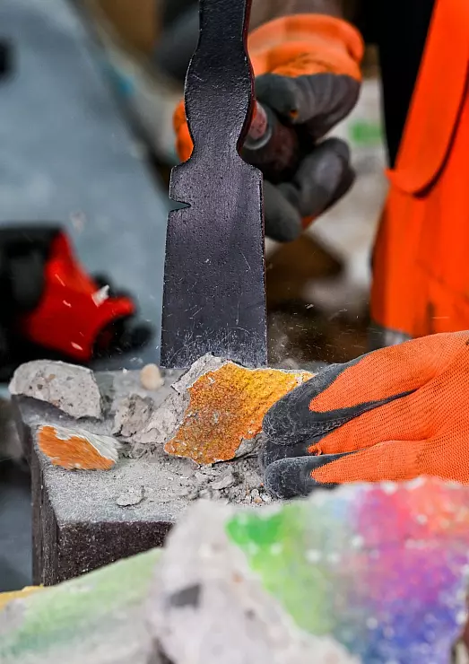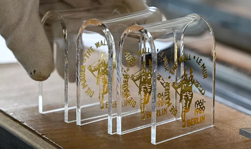 Denn das Zerkleinern der Mauer und das Zusammenstellen der Souvenirs sind echte Handarbeit. Metallschneider und Kreissägen kommen zum Einsatz, Hammer und Meißel sowieso. Plexiglasplatten werden erhitzt, geprägt und gebogen. Noch bevor die Mauer zerkleinert wird, kommt neue Farbe drauf. Denn die alte blättert mittlerweile ab - und bunt soll das kleine Souvenir dann bitte doch sein.