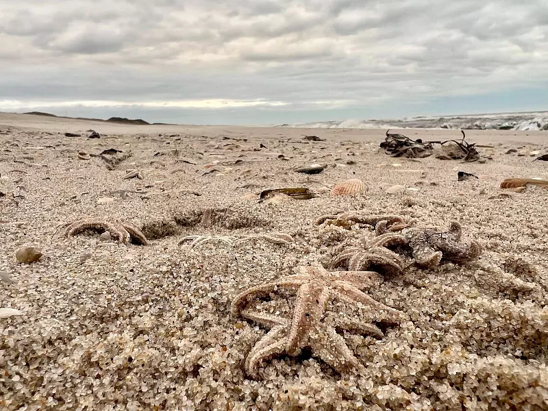Am Sylter Weststrand stoßen Spaziergänger aktuell auf eine unüberschaubar große Zahl von zumeist jungen Seesternen. Die Tiere wurden ans Ufer gespült und verenden dort. Mehrere Medien berichteten.