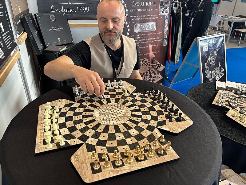 Lionel Blégean aus Frankreich hat schon als Teenager von einem Schachspiel mit mehr als einem Gegner geträumt. Er hat ein rundes Brett entwickelt, das strategisches Denken auf ein neues Niveau hebt. Einige Spielfeldreihen lassen sich drehen, was über die Mitte des Brettes neue Wege in den Bereich der Gegner verschafft. Vier Leute können zusammen spielen. Blégean vertreibt sein Spiel schon für 458 Euro.
