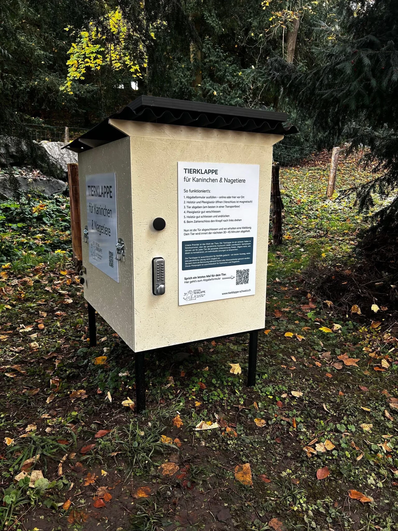 Die große Holzbox mit Ventilator und Kamera steht an einem Waldrand in Hilterfingen rund 30 Kilometer südöstlich von Bern. Wenn jemand ein Tier hineintut und die Box verschließt, werden Tierschützer alarmiert, die es innerhalb von weniger als einer Stunde abholen. Der Name «Tierklappe» ist etwas irreführend und erinnert an Babyklappen bei Krankenhäusern, in die Mütter in Not anonym ihre Neugeborenen legen können.