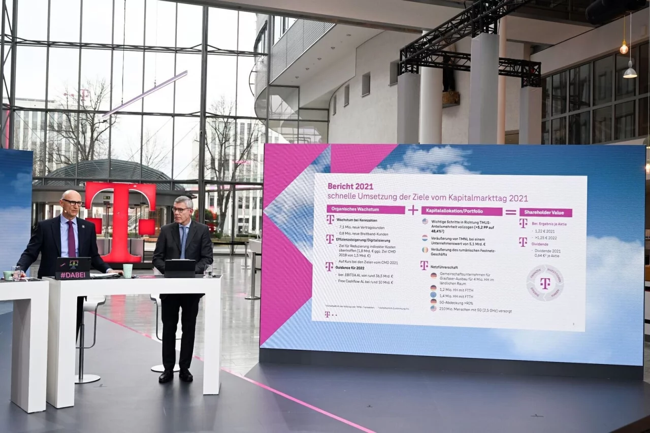 Konzernchef Höttges und der Finanzvorstand Christian Illek stellten auch die Telekom-Jahreszahlen für 2021 vor. Die sahen gut aus. Vor allem dank seiner amerikanischen Ertragsperle T-Mobile US konnte der Magenta-Konzern seinen strammen Wachstumskurs fortsetzen. Der Gesamtumsatz stieg im Vergleich zu 2020 um 7,7 Prozent auf 108,8 Milliarden Euro. Rund zwei Drittel davon entfielen auf die USA, wo die Erlöse mit einem Plus von 11,7 Prozent besonders stark anzogen. Der Zusammenschluss mit dem Mobilfunk-Anbieter Sprint mache sich bezahlt, resümierte Höttges. In Deutschland verbuchten die Bonner nur ein Umsatzplus von 1,6 Prozent auf 23,8 Milliarden Euro.