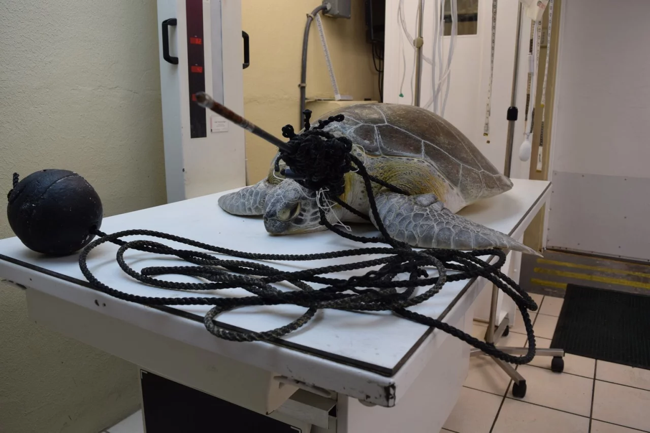 Marathon - Mitarbeiter einer Tierklinik in Florida haben einen Speer aus einer Meeresschildkröte entfernt. Die etwa 70 Kilogramm schwere Schildkröte war am Wochenende von einer Bootsfahrerin an einem Riff vor Key Largo entdeckt worden - durchschossen von einem Speer und verwickelt in eine Fangschnur.