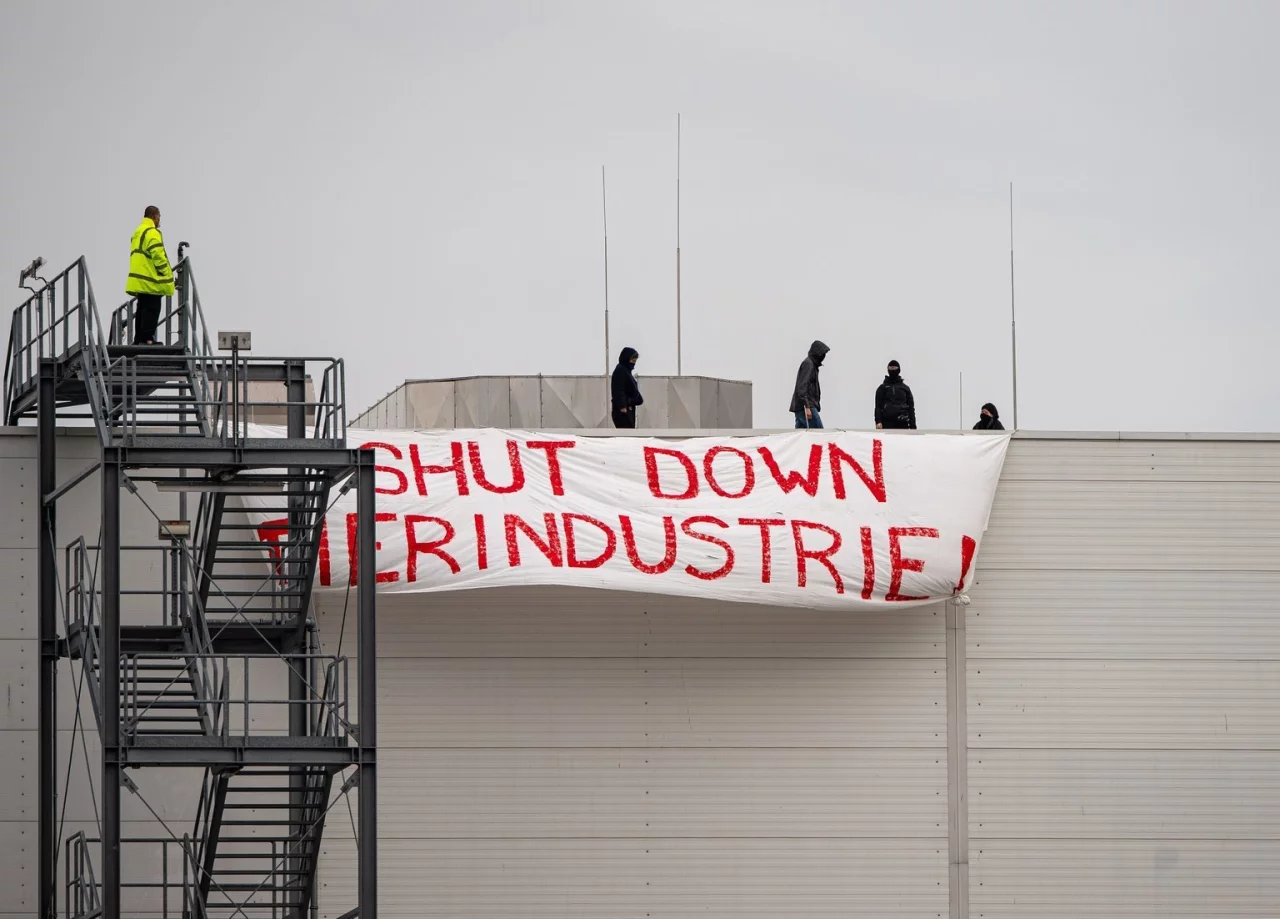 Vier Teilnehmer besetzten zeitweise das Dach des Betriebs und brachten dort ein Transparent mit der Aufschrift «Shut Down Tierindustrie» an.