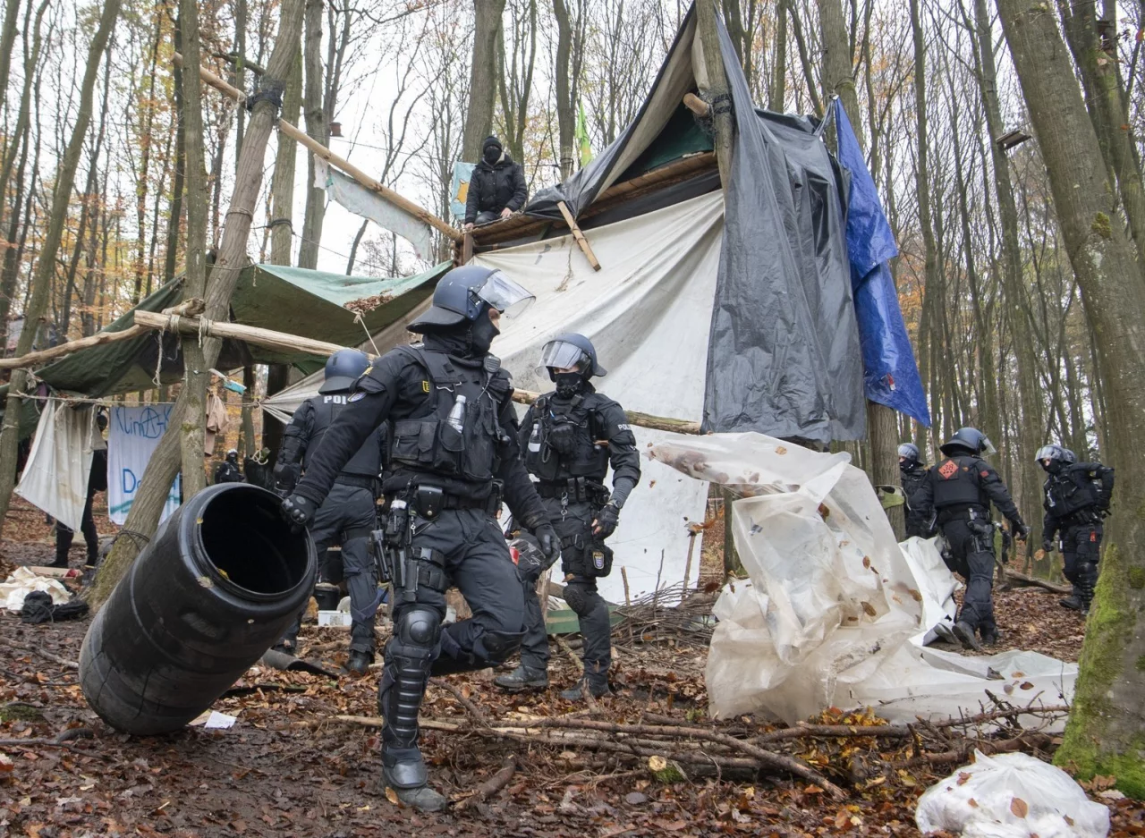 Die Beamten räumten größere Hindernisse wie gestapelte Baumstämme und Äste mit Draht von den Wegen. «Es ging darum, die Zufahrtsstraßen frei zu machen», sagte ein Polizeisprecher. Ein größeres Polizeiaufgebot rückte auch in eines der Waldbesetzer-Camps vor. Mehrere Demonstranten versuchten der Polizei zufolge, auf Baumaschinen zu klettern. Dabei sei ein Schlagstock eingesetzt und ein Aktivist verletzt worden.