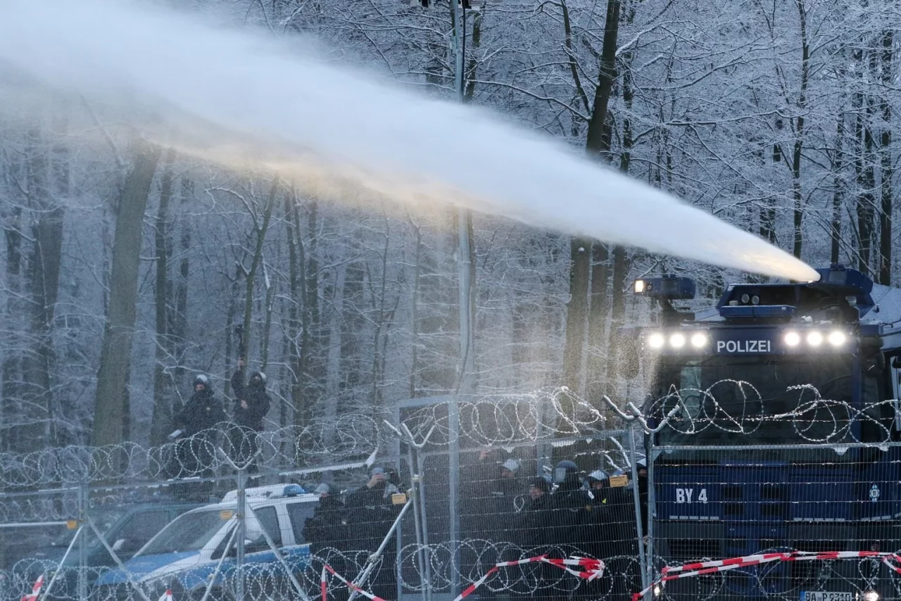 Festnahmen gab zunächst keine. Die Demonstranten seien lediglich abgedrängt worden, sagte ein Polizeisprecher am Nachmittag. Zugleich untersagte die Polizei den Aktivisten das Werfen von Schneebällen und drohte mit weiteren Einsätzen des Wasserwerfers. Ein Sprecher begründete die Anordnung mit einer möglichen Verletzungsgefahr für die Beamten. Ob es tatsächlich Verletzte gab, war zunächst unklar.