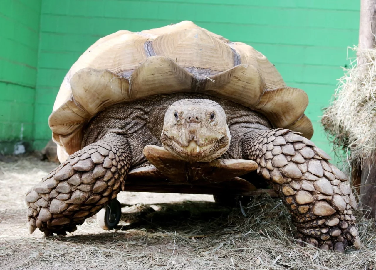 Für das Training wird die mehr als 100 Kilo schwere Spornschildkröte bisher von zwei Mitarbeitern auf das Brett mit vier Rollen gesetzt. Beim «Skaten» trainiere er die Muskeln und habe offensichtlich auch Freude und drehe auch schon mal eine Extrarunde, berichtet die Tierpflegerin - aber eben nur auf glattem Untergrund, nicht im Gelände. Das soll jetzt mit dem künftigen Schildkröten-Gehhilfe vom Fachmann besser werden.
