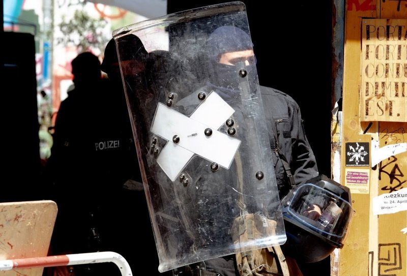 Anlass war die Durchsetzung einer lange angekündigten Brandschutzprüfung. Polizisten brachen am Donnerstagvormittag mit schwerem Gerät Türen auf. Bewohner aus der linksradikalen Szene, die seit langem zum Widerstand aufgerufen hatten, besprühten sie mit Pulver aus einem Feuerlöscher und bewarfen sie mit Farbe.