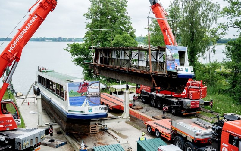 Der knapp 33 Meter lange und fünf Meter hohe Spezialtransport ging vom Bad Zwischenahner Meer knapp 20 Kilometer über Landstraße und Autobahn. Am Freitag soll die zweite Hälfte des Schiffes folgen, das längsseitig aufgesägt wurde und Anfang Juli wieder zusammengeschweißt werden soll.