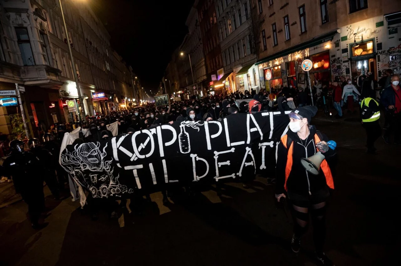 Unter den Demonstranten war auch ein großer Block schwarz gekleideter und vermummter Linksautonomer. Die Teilnehmer liefen von dem Gelände durch Kreuzberg nach Friedrichshain. Der Demonstrationszug mit dem Titel «Defend Køpi Wagenplatz» wurde von einem größeren Polizeiaufgebot dicht begleitet. Nach Beobachtungen eines dpa-Reporters waren mehr als 1000 Menschen auf der Straße.