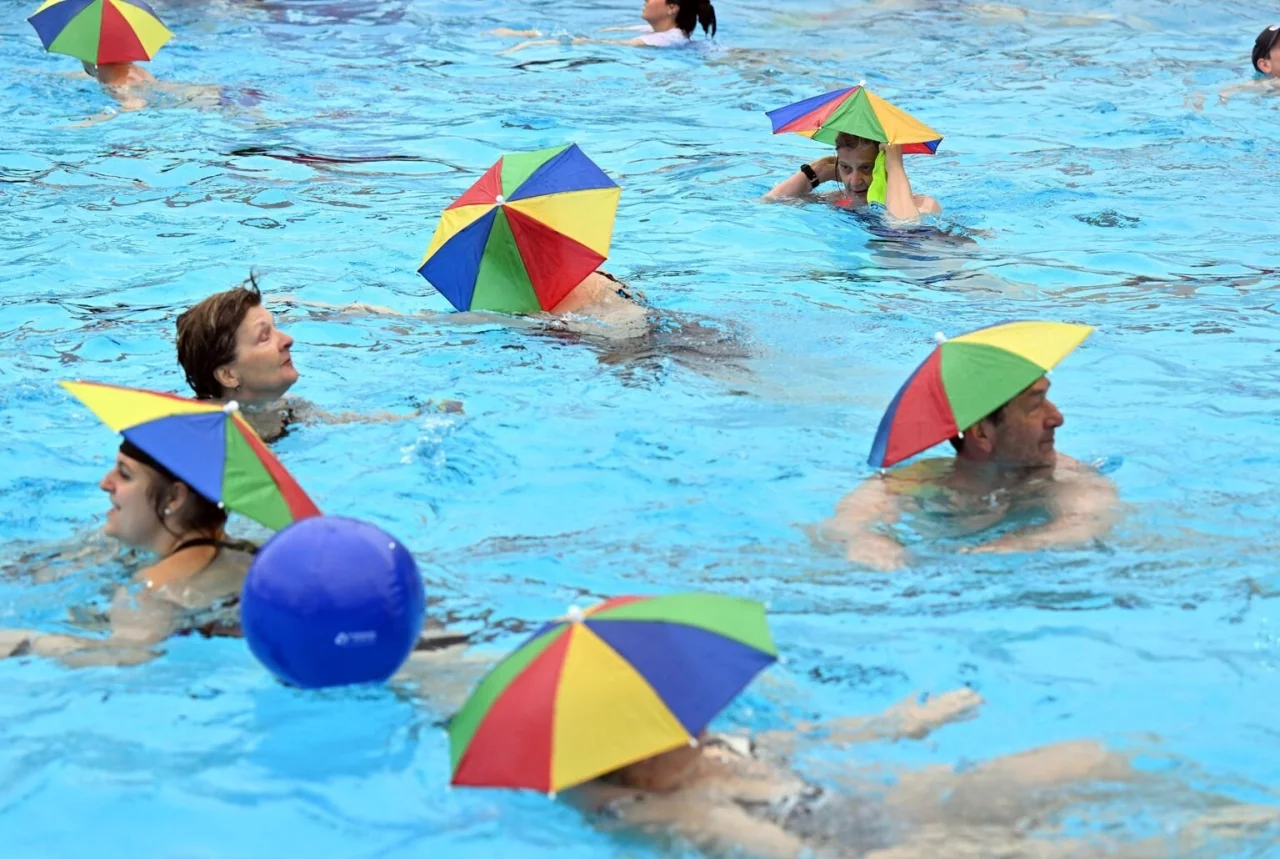 Zum Anbaden unter Corona-Bedingungen sprangen die ersten Badegäste in Vierergruppen nach dem Startschuss vom Beckenrand. Ihre Masken hatten sie vorher symbolisch an eine Leine gehängt. Zu den Klängen des Badnerlieds und unter dem diesjährigen Motto «Frisch auf, frisch auf ins Sonnenbad» zogen dann die ersten Schwimmer ihre Bahnen - gut behütet mit bunten Regenschirmhütchen, die der Freundeskreis des Sonnenbades verteilt hatte.