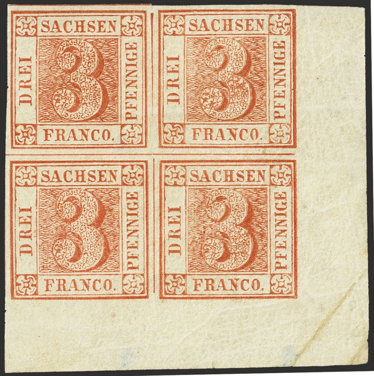 Die Briefmarke mit dem Nennwert von 3 Pfennigen war die erste im Königreich Sachsen. Sie stammt aus dem Jahr 1850. Der Ende März zur Versteigerung gestellte Block umfasst vier bräunlich-rote Marken und ist ungestempelt. Er stammt den Angaben zufolge aus der Privatsammlung des ehemaligen Tengelmann-Chefs Erivan Haub.
