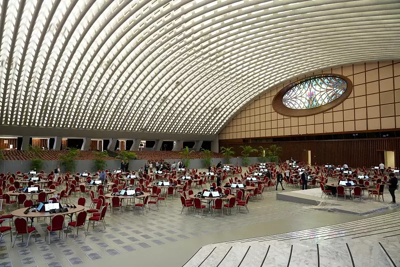 Der Arbeitsbereich für die Weltsynode im Vatikan. - © Gregorio Borgia/AP/dpa