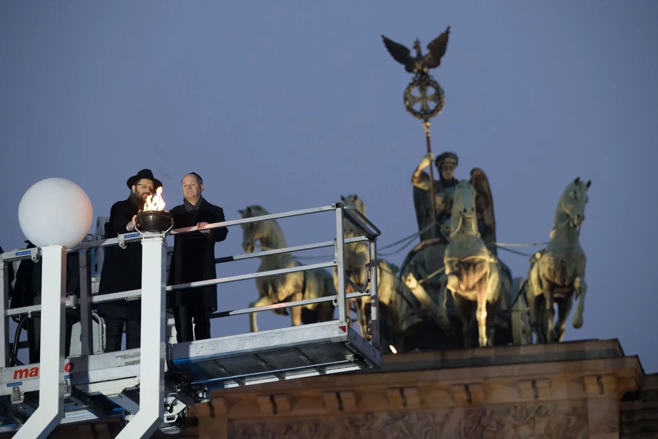 Darunter war erstmals auch Bundeskanzler Olaf Scholz, der am Ende auf einer Hebebühne neben Teichtal das erste Feuer auf dem zehn Meter hohen Leuchter entfachte. Für Scholz war es eine Geste der Solidarität - und genau das forderte der Kanzler auch von allen anderen im Land. «Wir nehmen es nicht hin, wenn jüdische Mitbürgerinnen und Mitbürger Angst haben müssen, offen ihre Religion, ihre Kultur, ihren Alltag zu leben, wenn sie ihr grundlegendes Recht wahrnehmen, sichtbar zu sein, ein Recht, das alle Menschen in unserer Gesellschaft haben, ohne Unterschied», sagte der SPD-Politiker.