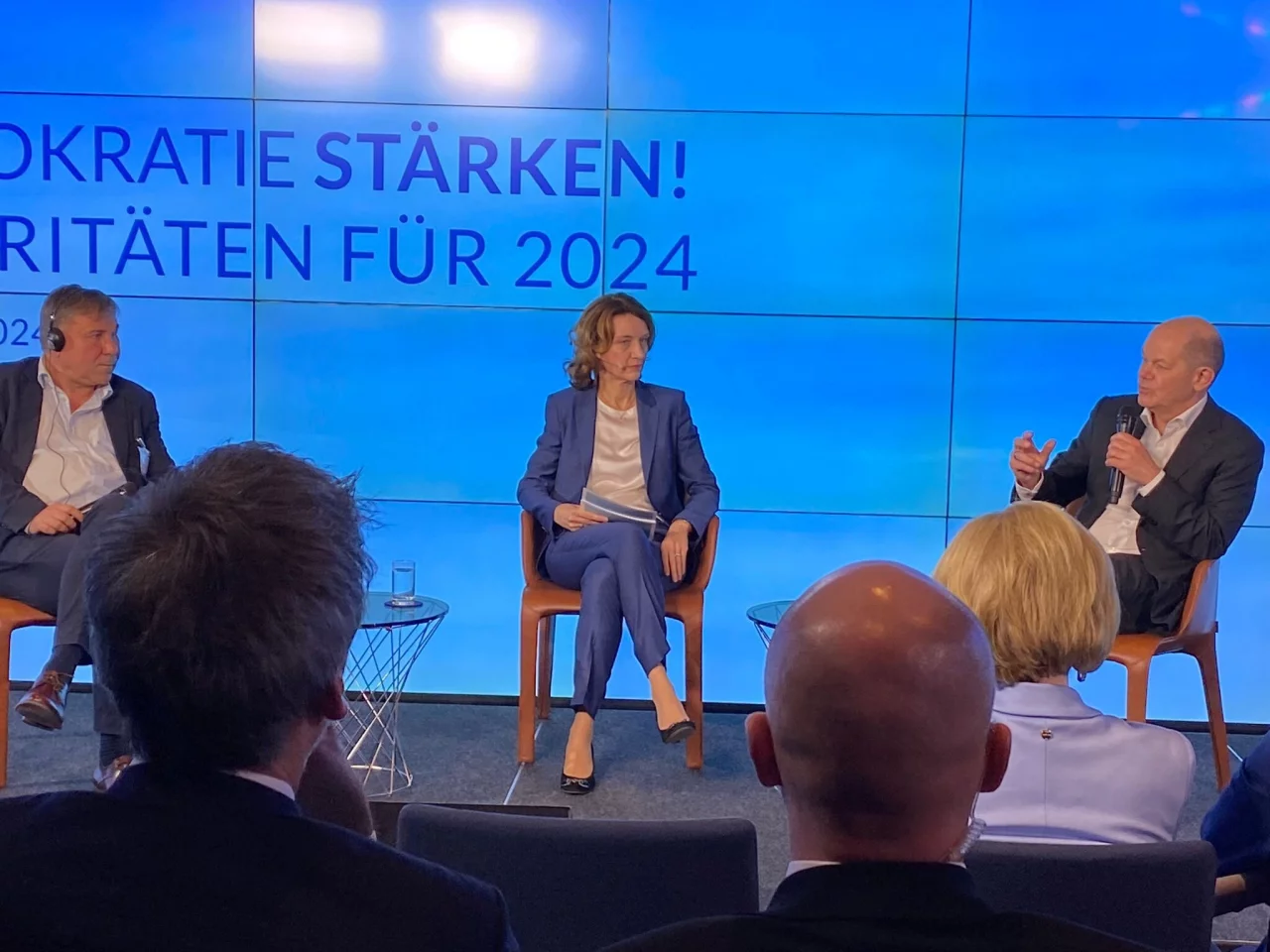 Berlin. Viel deutlicher hätte die Symbolik kaum sein können: Der Werderscher Markt 6 in Berlin liegt gleich gegenüber dem Auswärtigen Amt. Hierhin hatte die Bertelsmann Stiftung einen ausgewählten Kreis von gut 60 Gästen zu einem Gedankenaustausch von Bundeskanzler Olaf Scholz (SPD) mit dem bulgarischen Politologen Ivan Krastev geladen. Thema der von Daniela Schwarzer, Vorstandsmitglied der Stiftung, moderierten Veranstaltung: „Demokratie stärken! Prioritäten für 2024“.