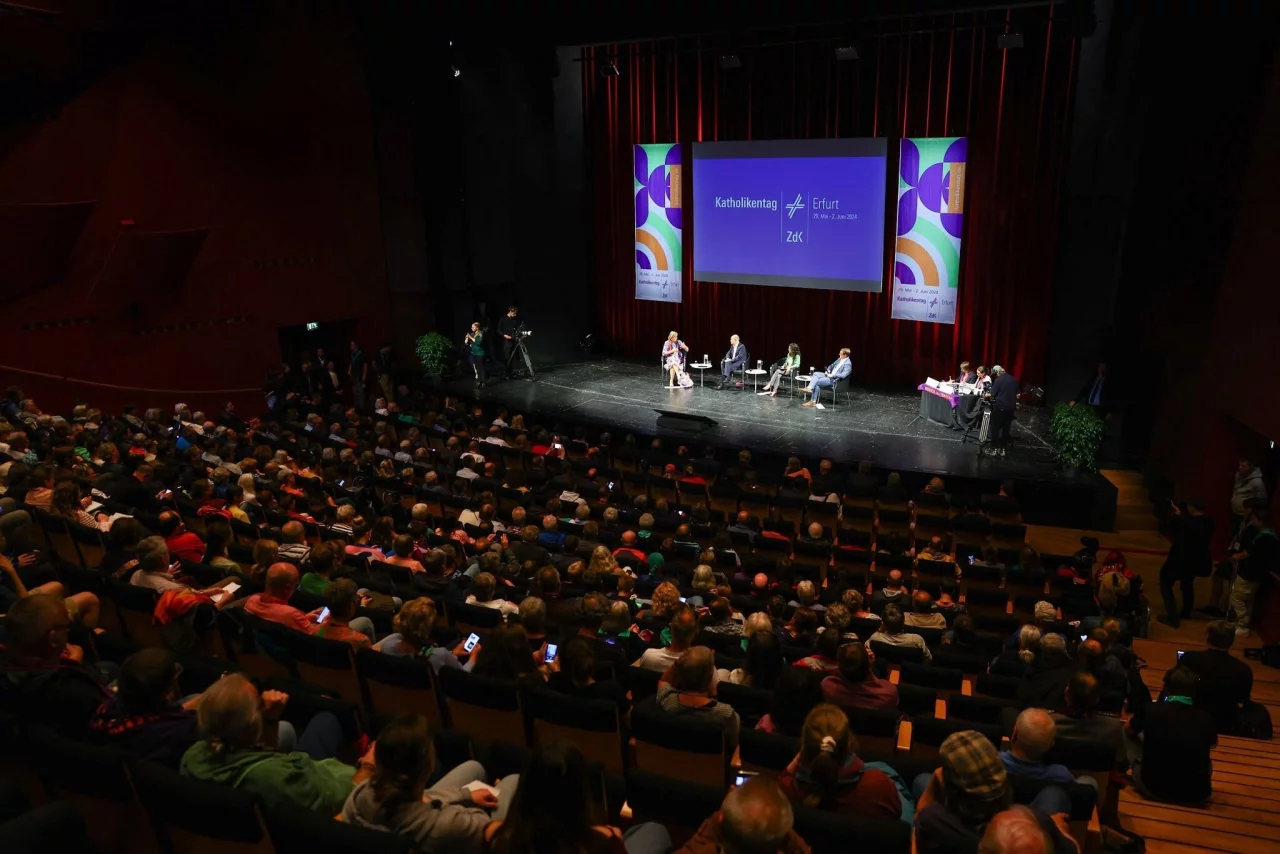 Die Erfahrung machte auch Vizekanzler Robert Habeck, der zeitgleich auf einem anderen Podium in der thüringischen Landeshauptstadt saß. Thema: Wie die sozial-ökologische Transformation beschleunigt werden könne. Der Grünen-Politiker wurde mit lautem Beifall in der voll besetzten Alten Oper empfangen. Und sammelte dann gleich weitere Pluspunkte bei den Gästen: Er entschuldigte sich, dass er offenbar zum ersten Mal auf einem Katholikentag dabei sei. Das sei ein «Versäumnis der Vergangenheit», sagte der Wirtschaftsminister, der sich in einem Interview einmal selbst als «säkularer Christ» bezeichnet hat.