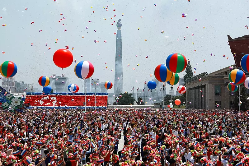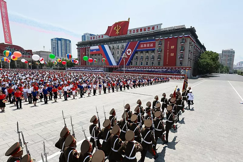 Vor Beginn der politischen Gespräche wurde Putin bei einer offiziellen Begrüßungszeremonie auf dem Kim-Il-Sung-Platz, dem städtebaulichen und symbolischen Zentrum Pjöngjangs, von einer jubelnden Menschenmenge begrüßt. Viele hielten russische Fähnchen in den Händen. Soldaten marschierten an Putin und Kim, die auf einer Bühne standen, vorbei.