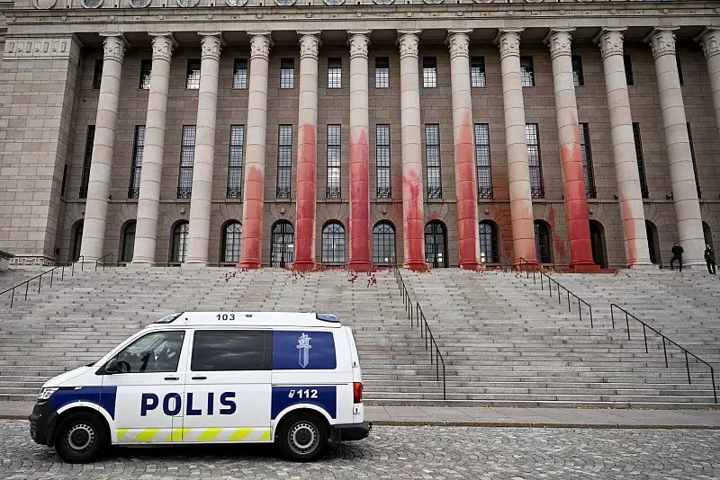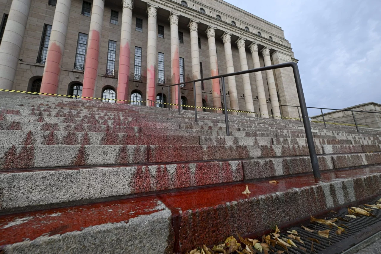 Klimaaktivisten haben den finnischen Reichstag in Helsinki mit blutroter Farbe verunstaltet. Die Farbe wurde auf mehrere zentrale Säulen des imposanten Parlamentsgebäudes gesprüht, auch am Haupteingang und auf den Treppen davor war sie zu sehen. Nach Polizeiangaben wurden zehn Menschen festgenommen, die nach der Aktion auf den Stufen des Gebäudes sitzen geblieben waren. Eine Reinigungskraft machte sich an die Arbeit, die Farbe per Hochdruckreiniger zu beseitigen.
