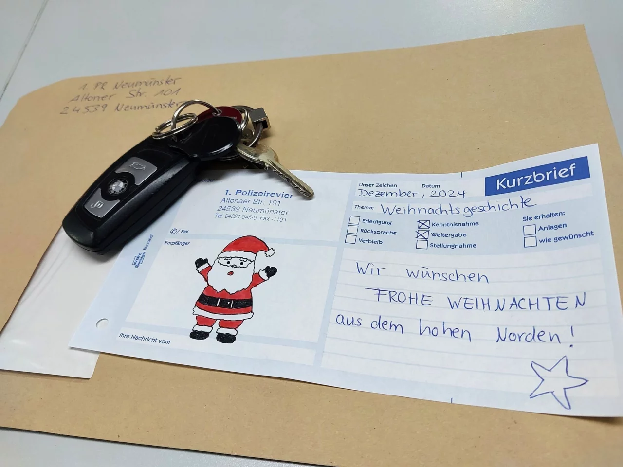 Die Polizei in Neumünster hat der Frau ihren Schlüsselbund nun zugeschickt, mit Weihnachtsgrüßen aus dem hohen Norden. «Zu Weihnachten war dies vermutlich ein letzter Weihnachtsgruß von ihrem verstorbenen Hund», hieß es dazu in der Polizeimitteilung. «Denn ohne die Marke hätte die Frau ihren Schlüsselbund wohl nicht wiederbekommen.»