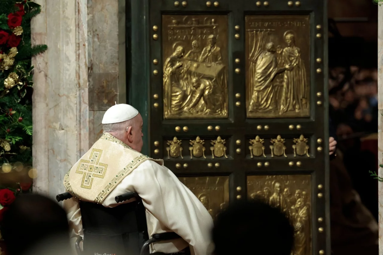 Der wegen eines schweren Knieleidens auf einen Rollstuhl angewiesene und gesundheitlich angeschlagene Franziskus saß zuvor vor der Schwelle der Tür und verharrte für einen Moment im stillen Gebet. Nachdem die Tür geöffnet worden war, wurde er über die Schwelle in den Petersdom gefahren.