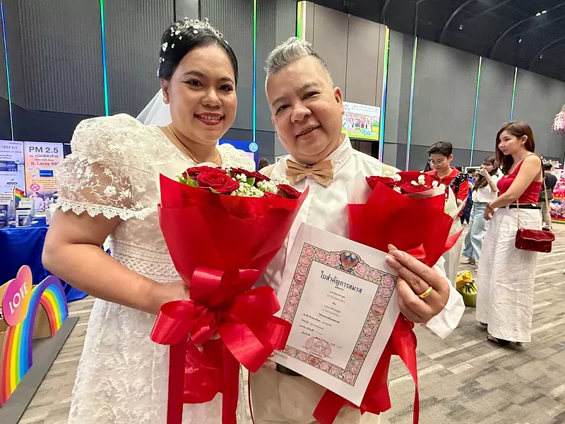 In der riesigen Paragon Hall im beliebten Einkaufszentrum Siam Paragon, im Herzen der Hauptstadt Bangkok, wurde gar eine Massenhochzeit organisiert. Schon am Morgen ließen sich Dutzende queere Paare registrieren und präsentierten anschließend den Kamerateams aus aller Welt ihre Heiratsurkunden.