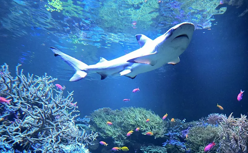 Die Haie kann man im Museum hinter dickem Aquariumsglas beobachten oder per Livestream aus dem Korallenbecken. Der grau-braune Schwarzspitzen-Riffhai zählt mit 1,60 bis maximal 2,00 Metern Länge eher zu den kleinen Haien. Die Art mit der auffallend schwarzen Spitze an der ersten Rückenflosse frisst üblicherweise Fische und wirbellose Tiere und gilt als scheu.