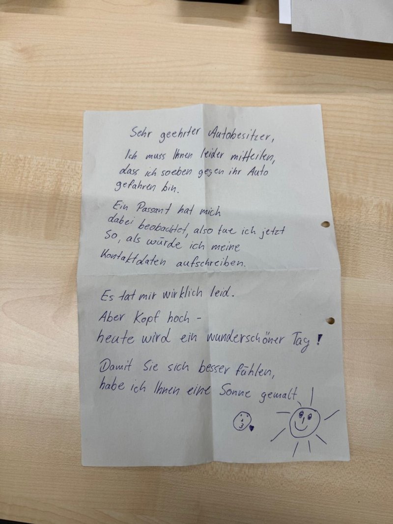«Ich muss Ihnen leider mitteilen, dass ich soeben gegen Ihr Auto gefahren bin», heißt es auf dem von der Polizei veröffentlichten Blatt Papier. «Ein Passant hat mich dabei beobachtet, also tue ich jetzt so, als würde ich meine Kontaktdaten aufschreiben.» Der Unbekannte schließt mit den Worten «Damit Sie sich besser fühlen, habe ich Ihnen eine Sonne gemalt» sowie entsprechender Zeichnung. Die Polizei sucht vor allem den in der Mitteilung erwähnten Passanten.