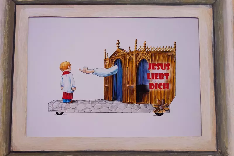 Auch der Missbrauch in der Kirche wird erneut aufgegriffen: Die Hand eines Priesters ragt aus einem Beichtstuhl und versucht, einen Messdiener hinein zu locken. Die Verspätungen bei der Bahn symbolisiert ein Skelett, das auf einem Bahnsteig bis zum Sankt-Nimmerleins-Tag auf einen Zug wartet.