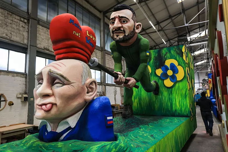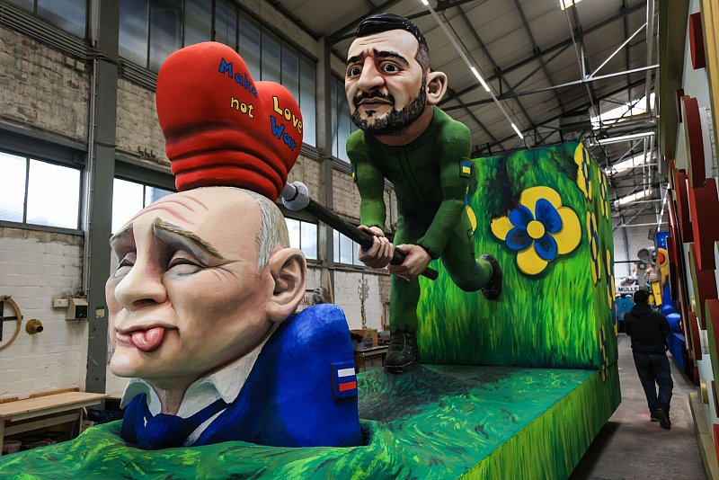 US-Präsident Donald Trump führt Freiheit und Recht an der Leine, ein riesiger Elon Musk und eine winzige AfD-Kanzlerkandidatin Alice Weidel sitzen zusammen im Sandkasten auf der Wippe. Der ukrainische Präsident Wolodymyr Selenskyj versucht, Russlands Wladimir Putin die Botschaft «Make Love not War» einzuhämmern, und Bundesgesundheitsminister Karl Lauterbach überbrückt Lieferengpässe bei Medikamenten und Personalmangel im Gesundheitswesen mit dem Rezept «Liebe ist die beste Medizin»: Das sind die Motive einiger Wagen des Kölner Rosenmontagszugs. Derzeit warten sie noch in einer Halle auf ihren großen Tag.