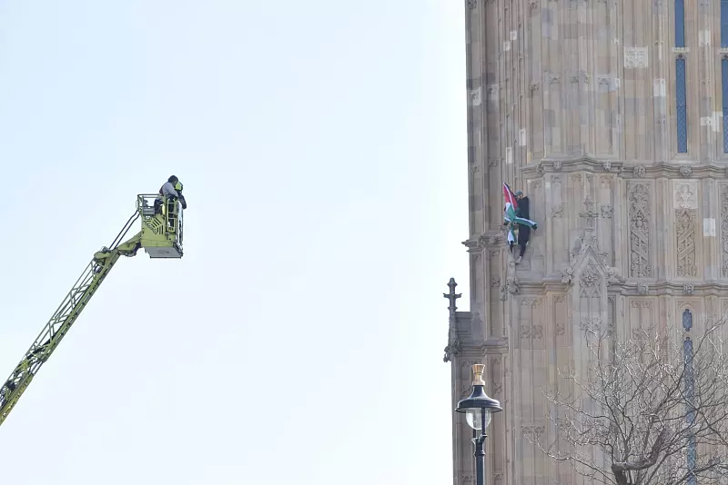 Der Demonstrant war am frühen Samstagmorgen auf den Elizabeth Tower geklettert. Fernsehbilder zeigten, wie er mit einer Hebebühne der Feuerwehr erst nach Mitternacht von dem Turm heruntergeholt wurde, in dem die berühmte Glocke Big Ben hängt.