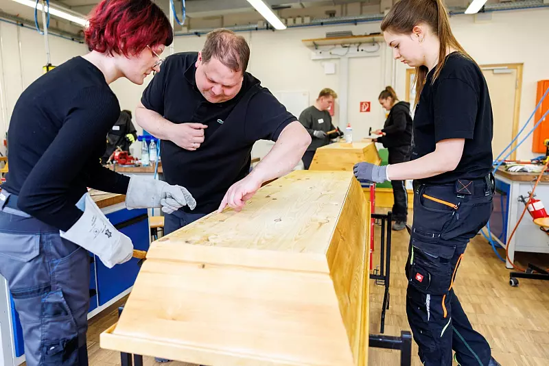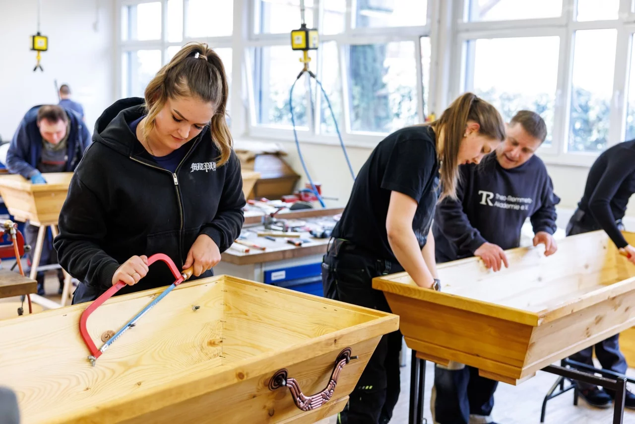 Bei den Azubis in der Werkstatt geht es nun ins Detail. «Die Löcher dürfen maximal 1,5 bis 2 Zentimeter Abstand haben», erklärt ein Ausbilder einer Gruppe junger Menschen. Sie stehen um einen Sarg, der noch mehr oder weniger im Rohbau ist. Gerade sollen die Löcher für die Sargdeckel-Schrauben angezeichnet werden. Zwar werden die Azubis die Särge später nicht unbedingt komplett selbst fertigen, aber sie mit Griffen oder Ausstaffierungen verfeinern und individuell anpassen.