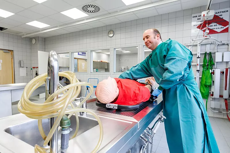 Auch wie ein Bestattungsinstitut architektonisch und farblich eingerichtet werden kann, damit sich trauernde Angehörige wohlfühlen, wird thematisiert. Auf dem nahegelegenen Lehrfriedhof lernen die Azubis den Umgang mit einem Bagger. Denn mancherorts heben die Bestatterinnen und Bestatter die Gräber aus. Leichenbergung gehört ebenfalls zu den Ausbildungsinhalten.