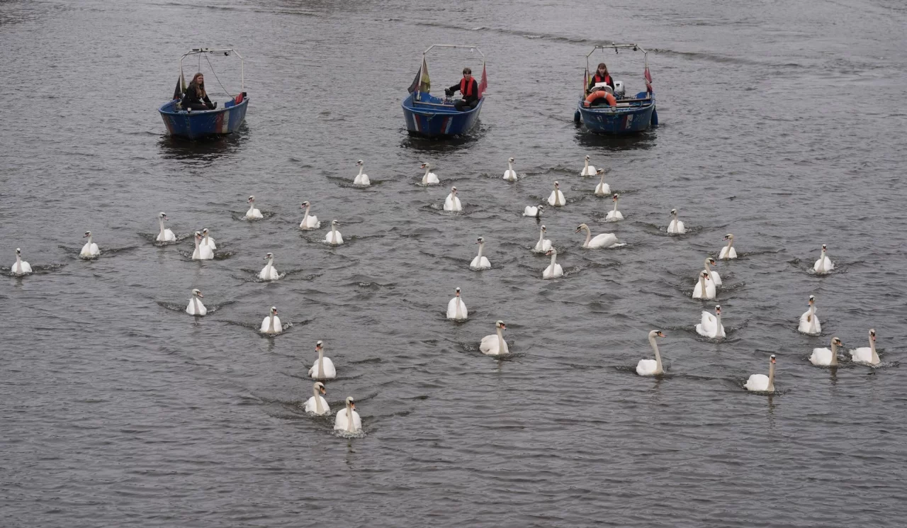 Bei wenig frühlingshaften Temperaturen haben die Hamburger Alsterschwäne ihr Winterquartier verlassen und schwimmen nun wieder auf den Gewässern der Hansestadt. Rund 50 Tiere wurden am Mittag vom sogenannten Schwanenvater Olaf Nieß und seinem Team mit Booten vom Winterquartier bis zur Außenalster geleitet. Der Rest der rund 90 Tiere ist bereits auf den Gewässern unterwegs. Von hier aus werden die Höckerschwäne ihre angestammten Brutplätze einnehmen und hoffentlich wieder für viel Nachwuchs sorgen.