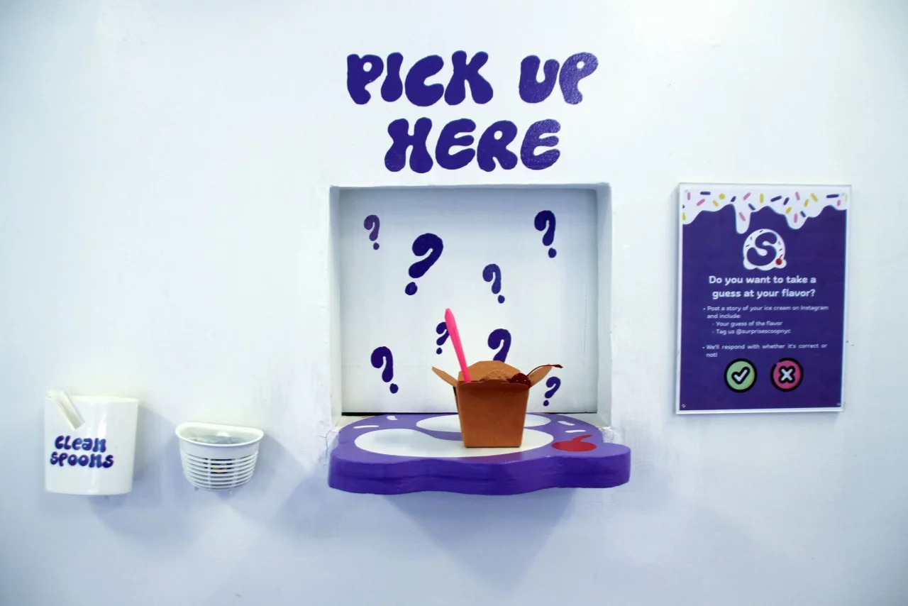Der Laden besteht aus einem leeren Raum mit einigen Bildschirmen, auf denen vorab bezahlt werden kann. Durch ein kleines Ausgabefenster in der Rückwand des Ladens wird kurz darauf das Eis gereicht - zwei Kugeln, mal mit Sirup oder Streuseln, mal mit einer Kirsche obendrauf.