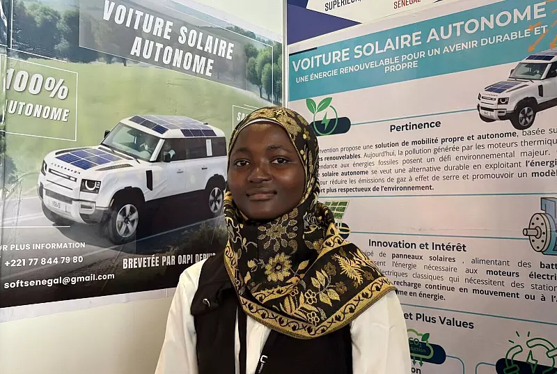 Die angehende Luftfahrtingenieurin Aminata Lo aus Senegal zeigt das von ihrem Vater erfundene Auto, das ausschließlich mit Solarzellen betrieben wird. Sie befinden sich auf Dach und Motorhaube, und da, wo sonst der Motor ist, sind Batterien eingebaut. Während der Fahrt laden sie sich automatisch auf.