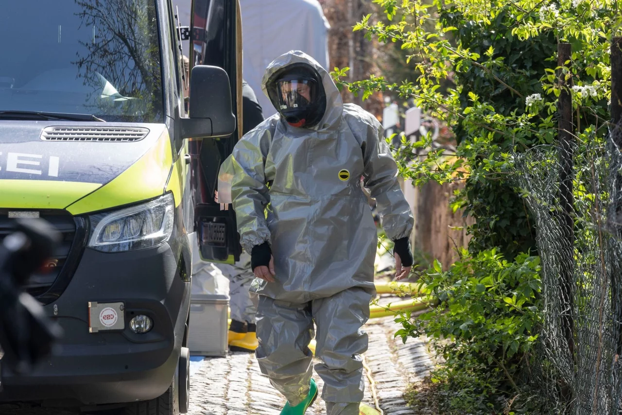 Die kleine, mit Pflastersteinen ausgelegte Straße, ist komplett blockiert von Fahrzeugen der Feuerwehr und Beamten des LKA. Der Blick auf den alten Dreiseitenhof bleibt verwehrt. Die Feuerwehr hatte am Vormittag eine sogenannte Dekontaminationsstrecke aufgebaut, erläuterte Anders vom LKA. «Ein Expertenteam des LKA ist nun unter Vollschutz in das Gebäude gegangen und wird das Labor untersuchen.»