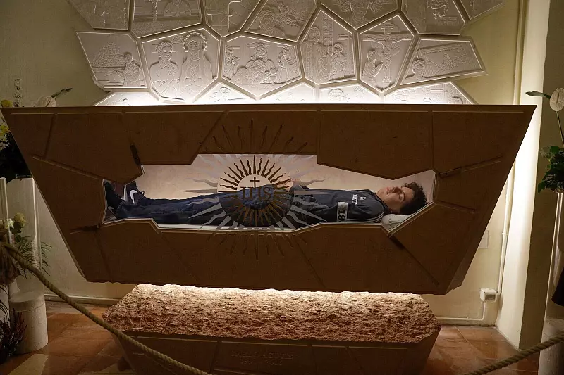 Seine sterblichen Überreste liegen nun in einem Sarkophag mit Glasscheibe, durch die man hineinschauen kann. Der tote Junge trägt Jeans und Turnschuhe. In die Hände hat man ihm einen Rosenkranz gelegt. Das Gesicht und die Hände wurden mit Silikon nachmodelliert. Gegenüber steht eine steinerne Bank für Besucher, die länger bleiben wollen. Aber die meisten gehen doch eher schnell vorbei. Fotografieren ist verboten.