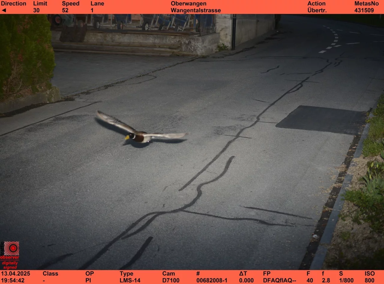 Eine rasende Ente ist nach Angaben einer Schweizer Gemeinde in die Radarfalle getappt. Sie wurde am 13. April in Köniz bei Bern mit 52 Kilometern in der Stunde geblitzt, in einer 30-km/h-Zone, wie die Aufnahme aus der Kamera zeigt, die die Gemeinde veröffentlicht hat.