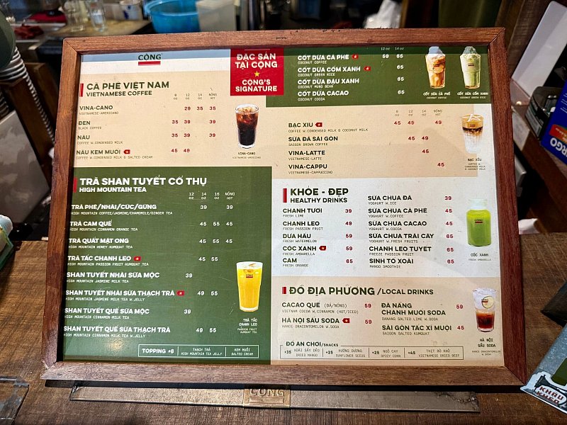 Gleichzeitig ist das südostasiatische Land nach Brasilien der zweitgrößte Kaffeeproduzent der Erde - und international berühmt als Kaffeehochburg mit kräftigen Robusta-Bohnen. Absolute Spezialität und Bestseller im Cong Caphe ist ein eisgekühlter Kokosnuss-Kaffee. Aber es gibt auch versöhnliche Getränke - wie den tiefschwarzen «Vina-Cano», kurz für «Vietnamese-Americano».