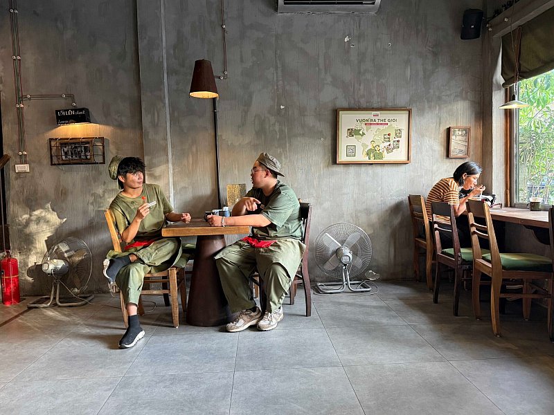 «Wir wollen mit unserer Kluft die Soldaten von damals ehren, die für unser Land gekämpft haben», sagt der Mitarbeiter Duc Anh Lee und rückt sich seine dunkelgrüne Militärkappe zurecht. Vor der Theke drängen sich Jugendliche und digitale Nomaden, um ihre Bestellung aufzugeben. Denn Vietnam ist ein junges Land: Wie der Großteil seiner Landsleute ist auch Duc erst nach dem Krieg (1955 bis 1975) geboren.