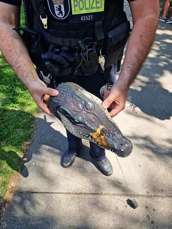Wegen eines vermeintlichen Alligators sind Polizisten zu einem Teich in Berlin-Weißensee gerufen worden. Als die verwunderten Beamten am Freitag am Kreuzpfuhl eintrafen, stellte sich das Raubtier jedoch schnell als ungefährlich heraus. Im Wasser schwamm nur eine täuschend echte Attrappe, wie die Polizei mitteilte. Es hätte sich «wohl jemand einen Scherz erlaubt», schrieben die Sicherheitskräfte auf Facebook. Das Technische Hilfswerk barg die Attrappe aus dem Wasser. Über 200 Menschen beobachteten nach Polizeiangaben den «Alligator» im Wasser.
