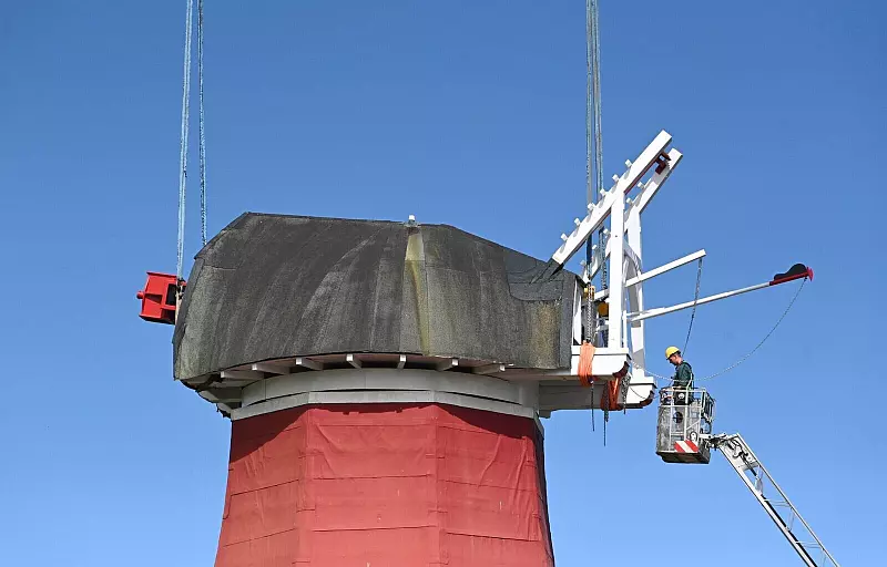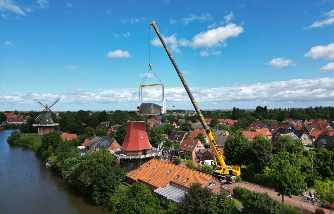 Die bekannte rote Windmühle im ostfriesischen Fischerort Greetsiel (Landkreis Aurich) ist nicht mehr länger kopflos. Ein Autokran hievte die sanierte, tonnenschwere Kappe auf das Bauwerk, später sollten auch die neuen Flügel an die Mühle angebaut werden.
