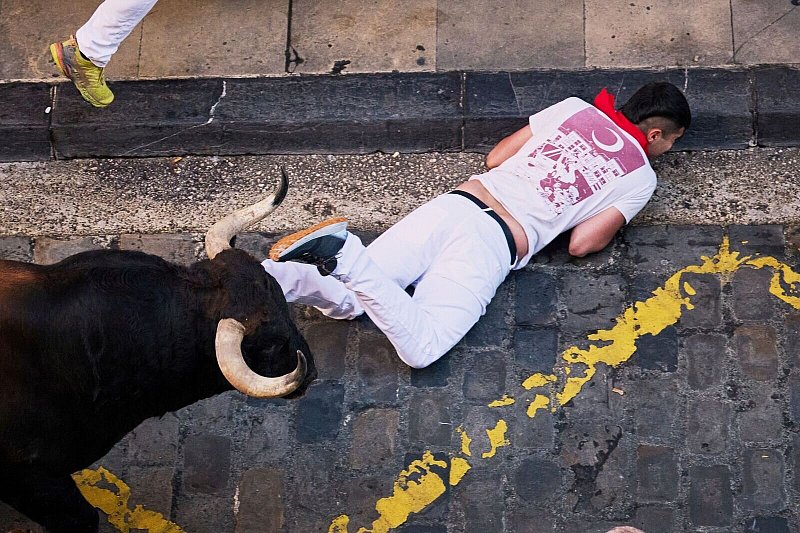 Beim dritten von insgesamt acht Läufen kam es zu vielen Stürzen. In den engen Gassen laufen derart viele Teilnehmer, dass sie oft nicht ausweichen können, wenn ein Läufer vor ihnen stürzt. Die galoppierenden Bullen versuchen zum Glück meist, reflexhaft über am Boden liegende Menschen zu springen.