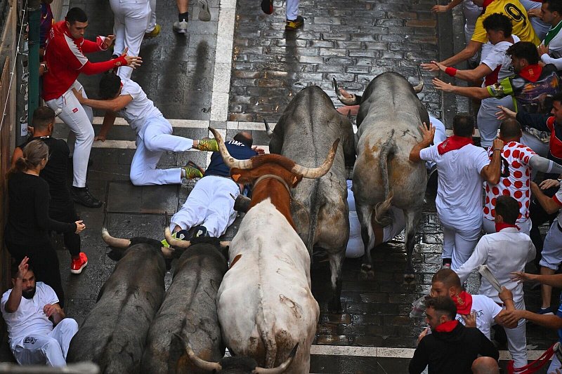 Die langen spitzen Hörner der Stiere können auch tödliche Verletzungen verursachen. Seit 1924 gab es 16 Todesopfer, das letzte im Jahr 2009. In den engen Gassen liefen gerade auch am Samstagmorgen derart viele Teilnehmer mit, dass sie oft nicht ausweichen können, wenn ein Läufer vor ihnen stürzt. Dann fallen viele Teilnehmer übereinander. Die bis zu 600 Kilogramm schweren Bullen versuchen im Galopp - meist zum Glück - reflexhaft über am Boden liegende Menschen zu springen.