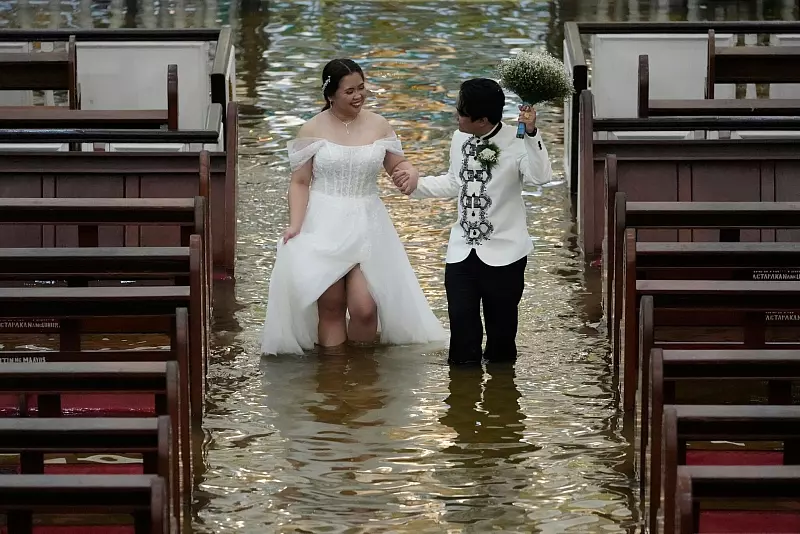 Beinahe wäre ihre Trauung buchstäblich ins Wasser gefallen - aber auch ein Sturm samt überfluteter Kirche konnte ein Paar auf den Philippinen nicht davon abhalten, sich das Jawort zu geben. Während der Bräutigam mit hochgekrempelten Hosen in Gummistiefeln wartete, schritt die Braut im weißen Kleid durch mehr als knöchelhohes Wasser zum Altar. Der philippinische Nachrichtensender ABS-CBN sprach von einer «Szene wie aus einem romantischen Drama».
