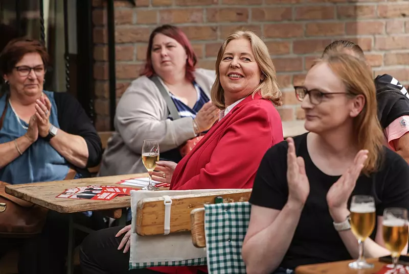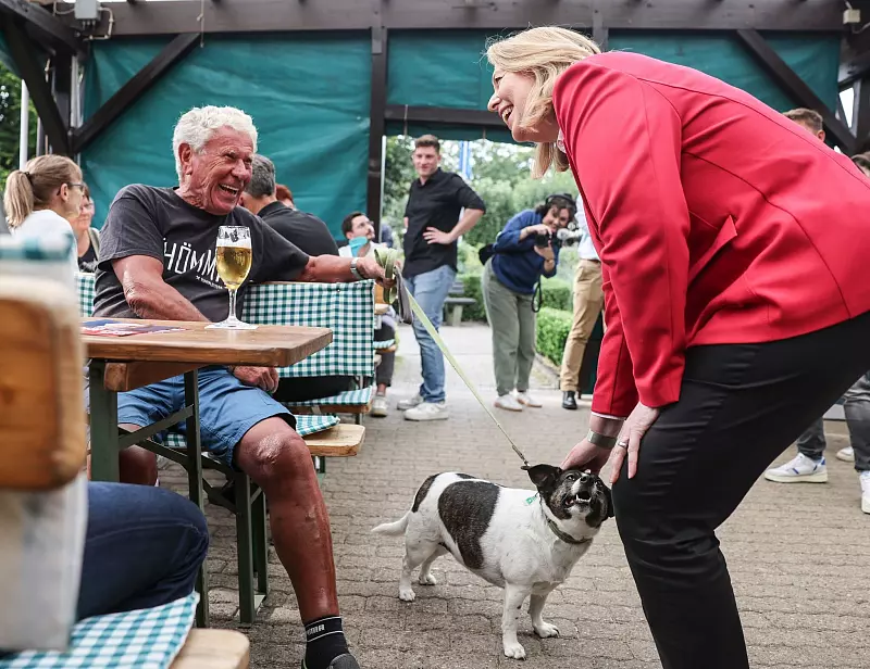 Bas kommt jetzt, um die Abstiegskämpfer dabei zu unterstützen: Ihren eigenen Wahlkreis Duisburg I hat sie im Februar ganz klar eingesackt. Jetzt schüttelt sie Hände, streichelt Hunde - und trinkt auch mal ein Bier mit. Die SPD-Chefin sucht den Kontakt.