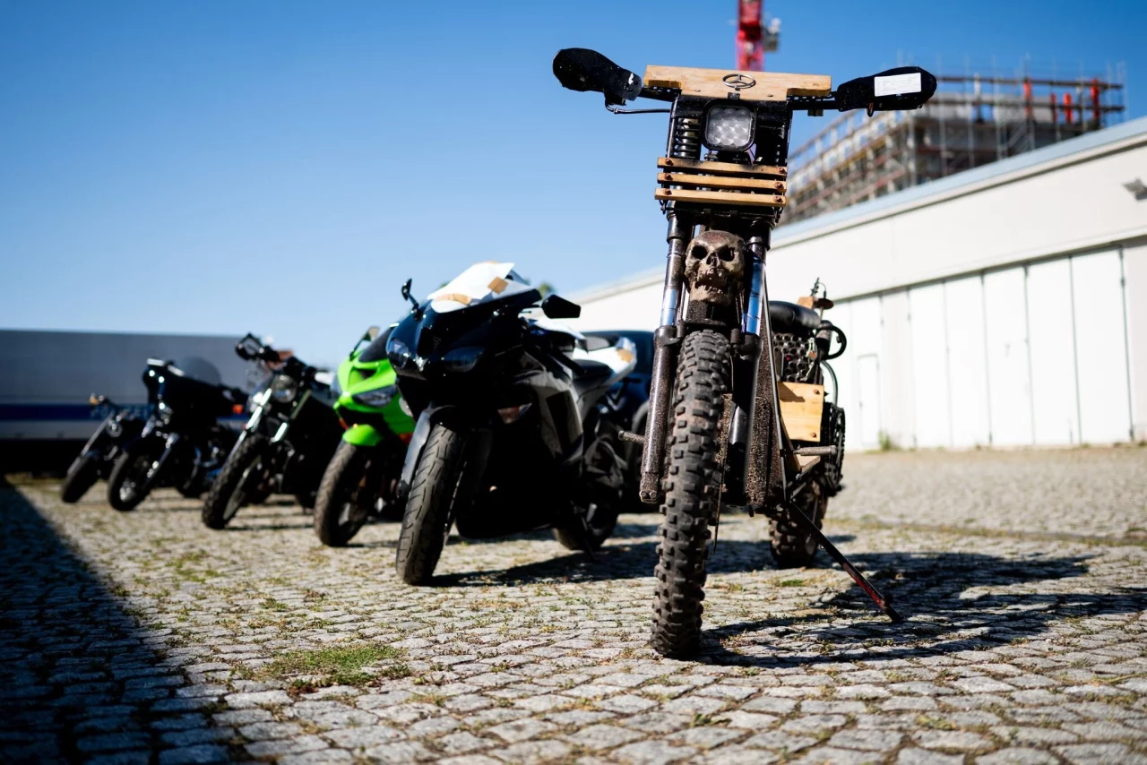 Mehrere Motorräder stehen nun auf einem Parkplatz des Thüringer Landeskriminalamts: Die Polizei hat sie bei einer großangelegten Razzia im Rockermilieu sichergestellt. Die Beamten durchsuchten 18 Objekte in Sachsen, Thüringen und Bayern. Der Schwerpunkt der Ermittlungen lag in Südthüringen, sagte der Vize-Präsident des Thüringer LKA, Heiko Schmidt. Es geht um den Verdacht der schweren räuberischen Erpressung. Die Ermittlungen richten sich gegen zehn Deutsche im Alter zwischen 20 und 50 Jahren. Festnahmen gab es keine.